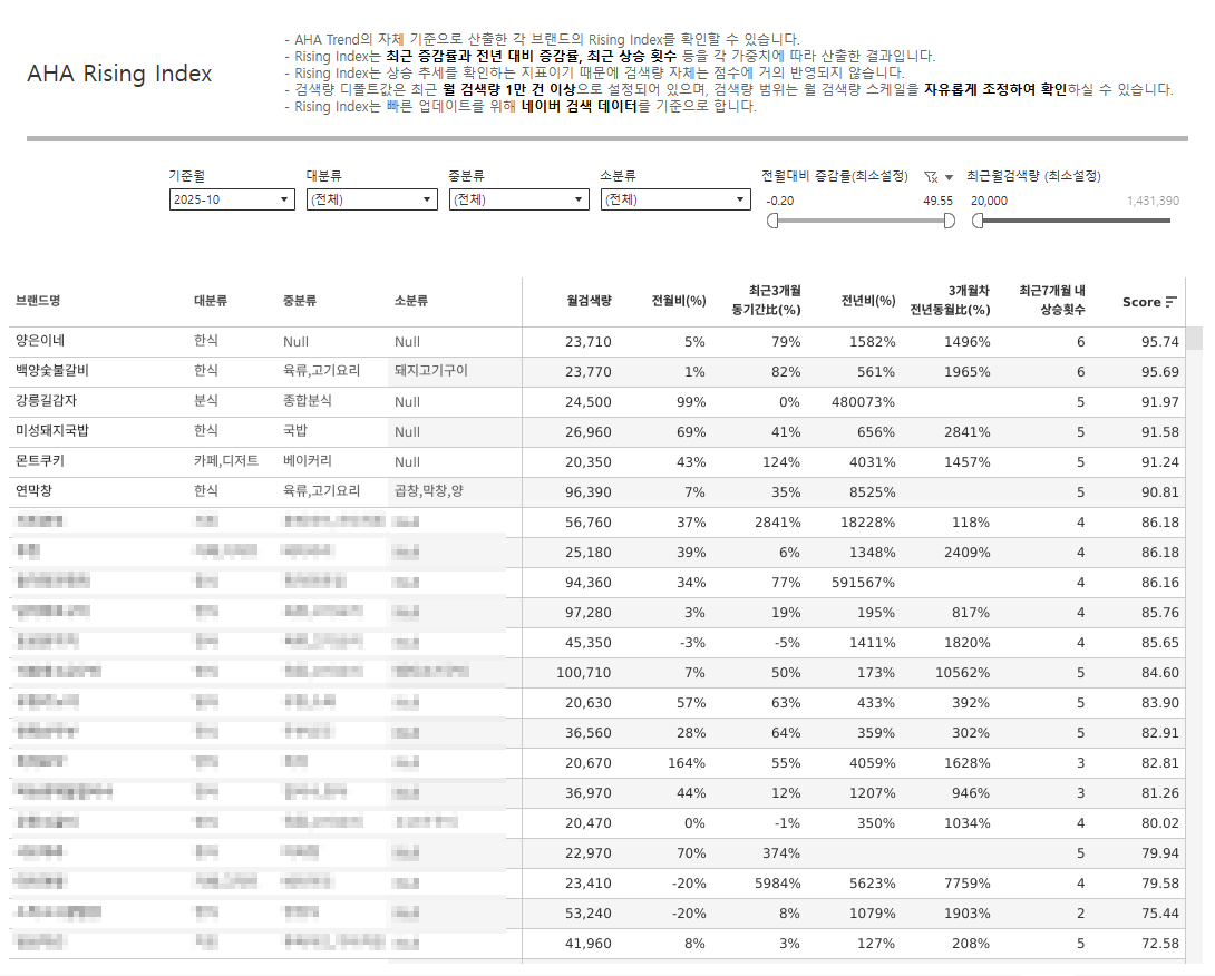 ** AHA Trend 자체 기준으로 산출한 각 브랜드의 Rising Index를 확인할 수 있습니다.