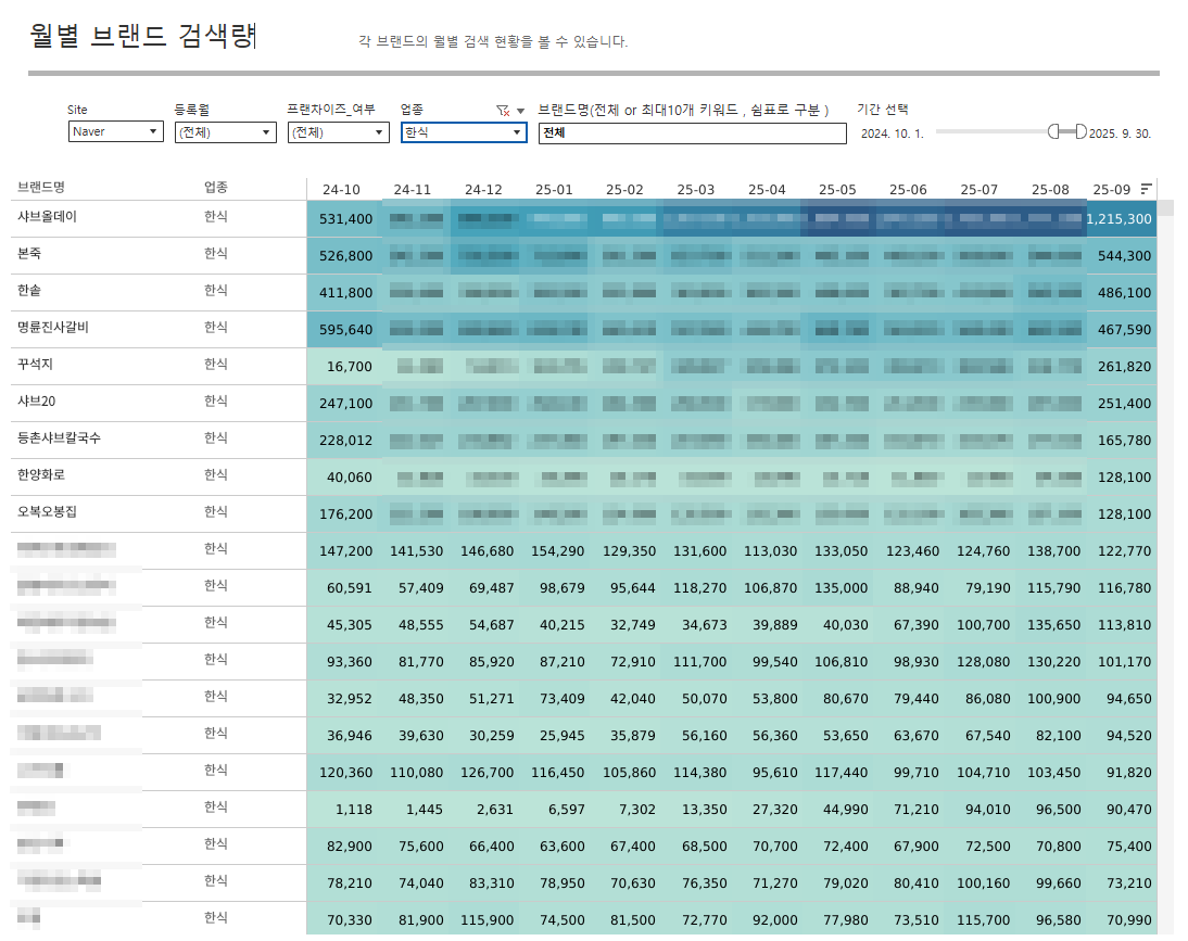 외식 브랜드의 검색 데이터를 조사하여 여러 통계와 분석 결과를 발표하고 있습니다.