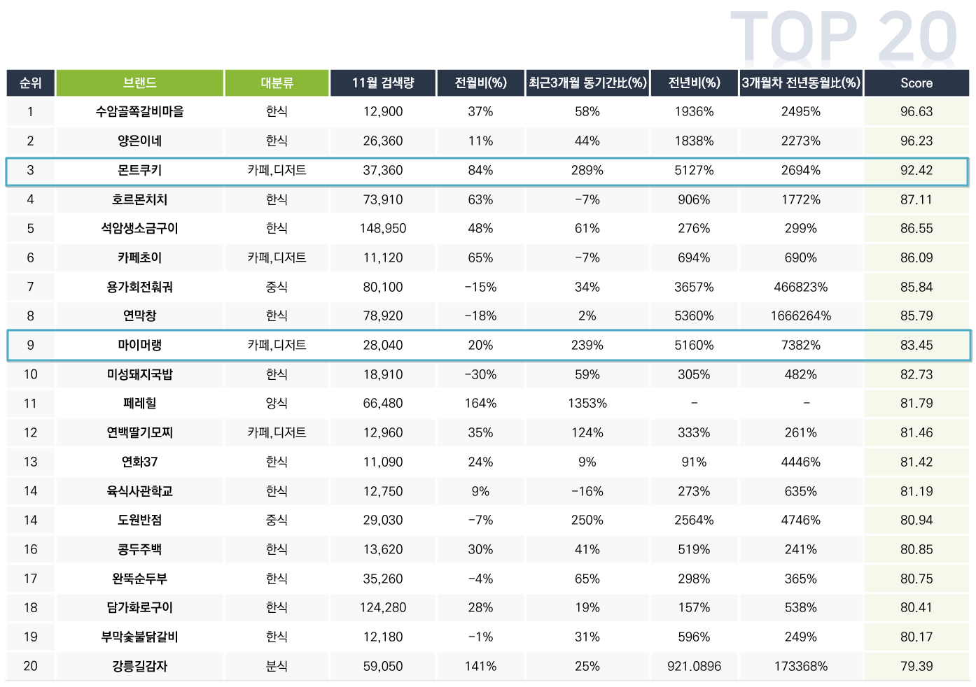 외식 브랜드의 검색 데이터를 조사하여 여러 순위를 발표하고 있습니다.