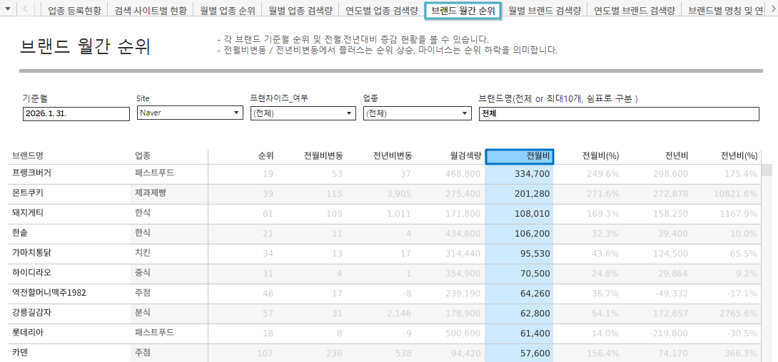 전월비(전월 대비 검색량 증감 순), 전월비(%)(전월 대비 검색량 증감률 순), 전년비(전년 대비 검색량 증감 순), 전년비(%)(전년 대비 검색량 증감 비율 순) 등으로 확인하실 수 있습니다. 또한 순위로도 전월 대비 가장 많이 랭킹이 오른 브랜드, 전년 대비 가장 많이 랭킹이 오른 브랜드 등도 확인하실 수 있습니다.