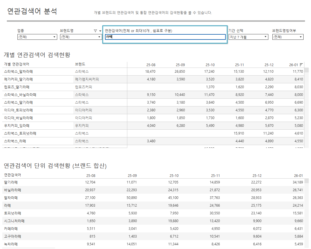 외식 브랜드 검색 분석 서비스 대시보드 가운데 연관검색어 분석을 보시면, 어느 정도 힌트를 얻으실 수 있습니다.