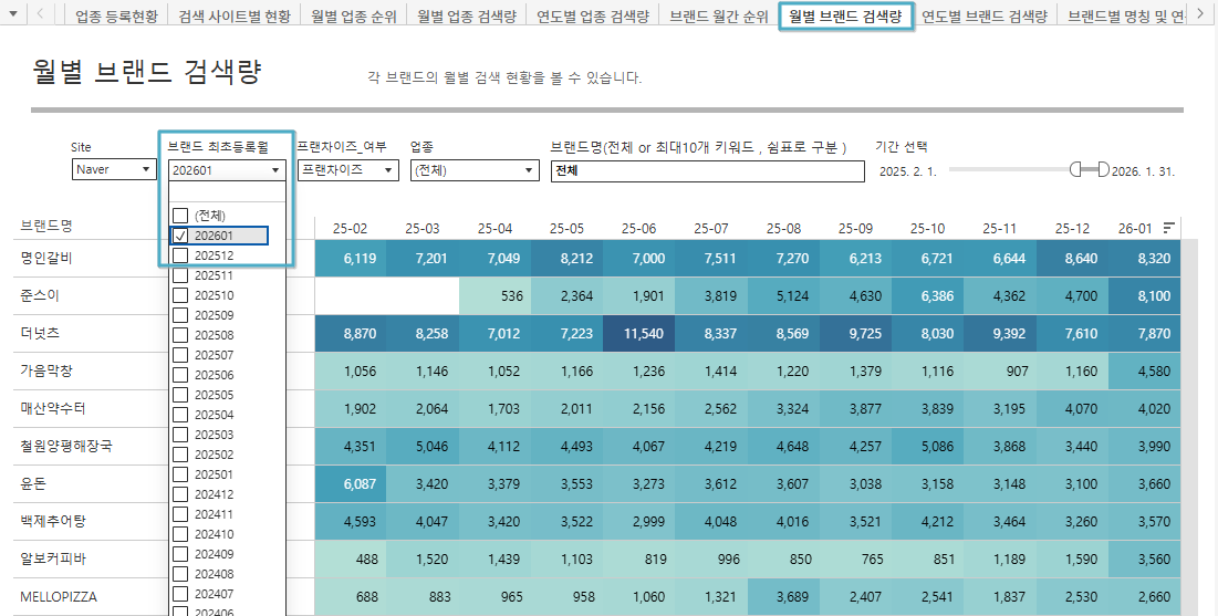 외식 가맹 사업을 하고자 등록한 프랜차이즈 브랜드나, 非 프랜차이즈 브랜드 중에서도 소비자의 검색이 많이 발생하여 기준 검색량 이상으로 올라온 브랜드들을 해당 월에 포착하여 매월 새롭게 등록하고 있습니다.