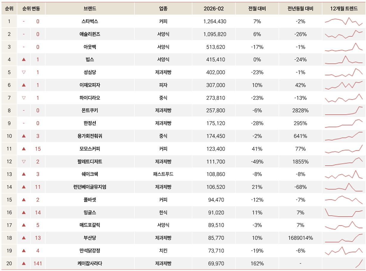 ** 선풍적이었던 ‘두쫀쿠’ 인기가 한풀 꺾인 것으로 보임. '몬트쿠키'는 -6% 정도로 선방하였으나 '팔레트디저트'는 -49%로 절반 가량 감소하였으며 '마이머랭', '키친205' 등은 차트 아웃됨.