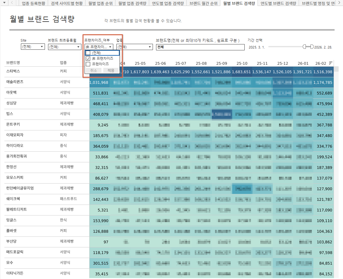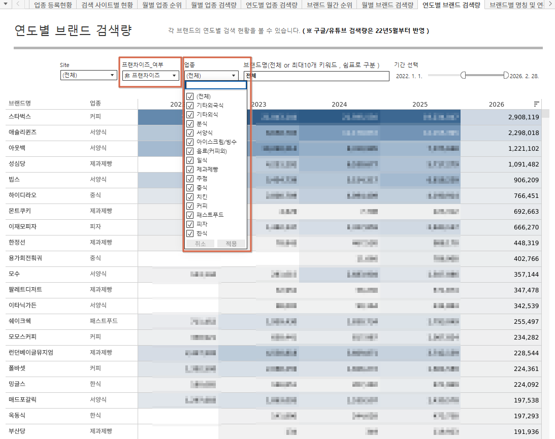 외식 브랜드의 검색 데이터를 조사하여 여러 순위를 발표하고 있습니다.