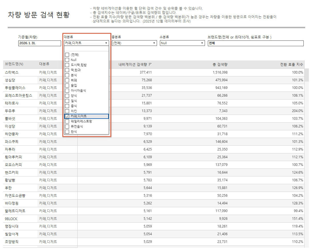차량 내비게이션 검색량은 주차 시설이 되어 있는 외식 브랜드 및 도심 외곽의 음식점, 베이커피 카페 등이 높은 수치를 보이는 경향이 있습니다.