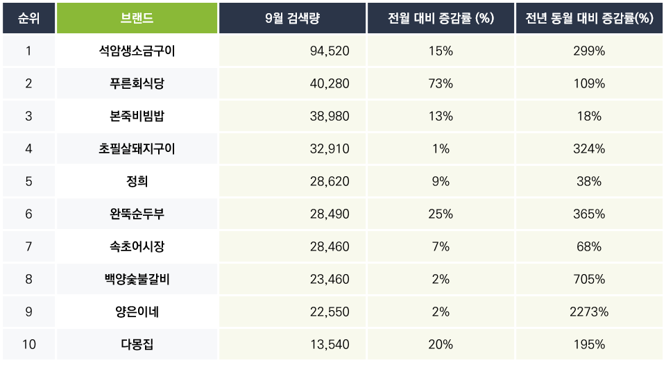 <석암생소금구이>가 9월 검색량 9만 4천 건, 전년 동월 대비 299% 상승을 기록하였습니다.