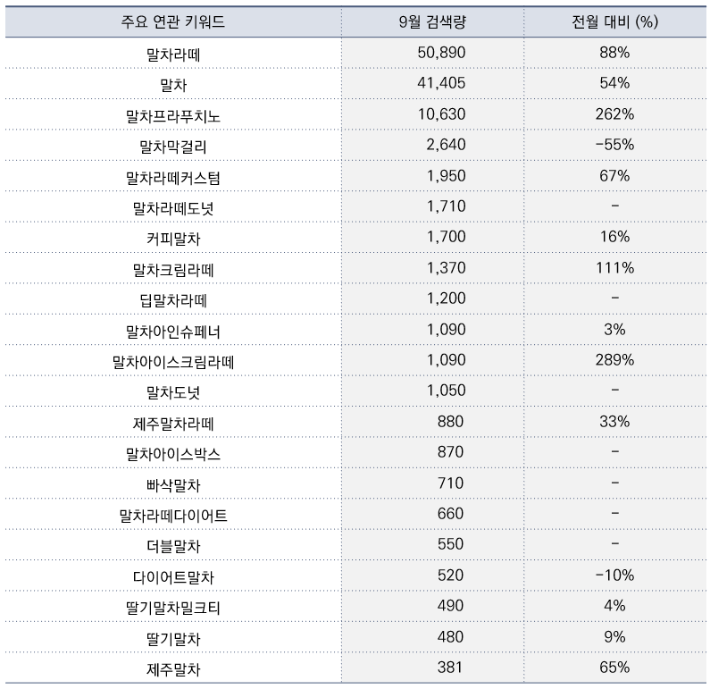 전월에 이어 9월에도 말차 라떼, 말차 프라프치노, 말차 도넛 등이 일제히 상승하였습니다.