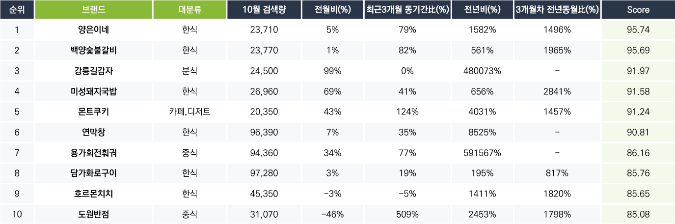 ** 아래는 10월 검색량 2만 건 이상 브랜드 가운데 AHA Rising Index가 높은 순으로 꼽은 10개 브랜드입니다.