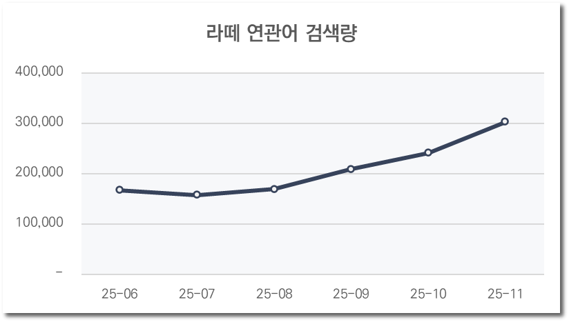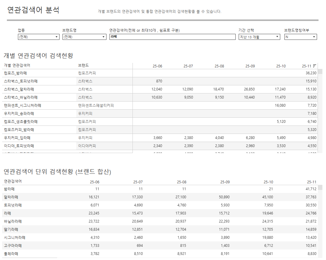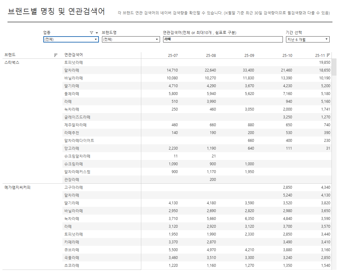 지난 6월부터 11월까지 외식 브랜드 연관 키워드 가운데 '라떼'가 포함된 키워드들의 검색량이 상승하는 추세를 보이고 있습니다.