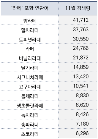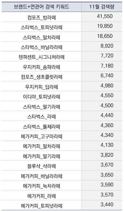 겨울이 시작되며 따뜻한 라떼에 대한 검색이 전반적으로 상승하였습니다.