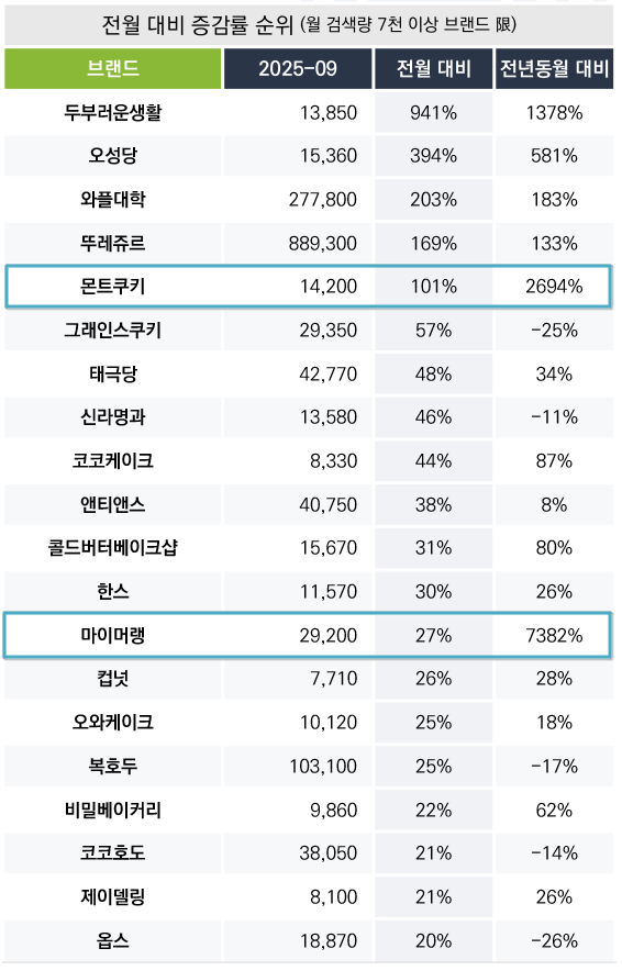 9월 데이터가 담겨 있는 리포트의 제과제빵 업종 분석에서 몬트쿠키가 전월 대비 101% 상승하며 5위로, 마이머랭이 27% 상승하며 13위로 등장하기 시작합니다.