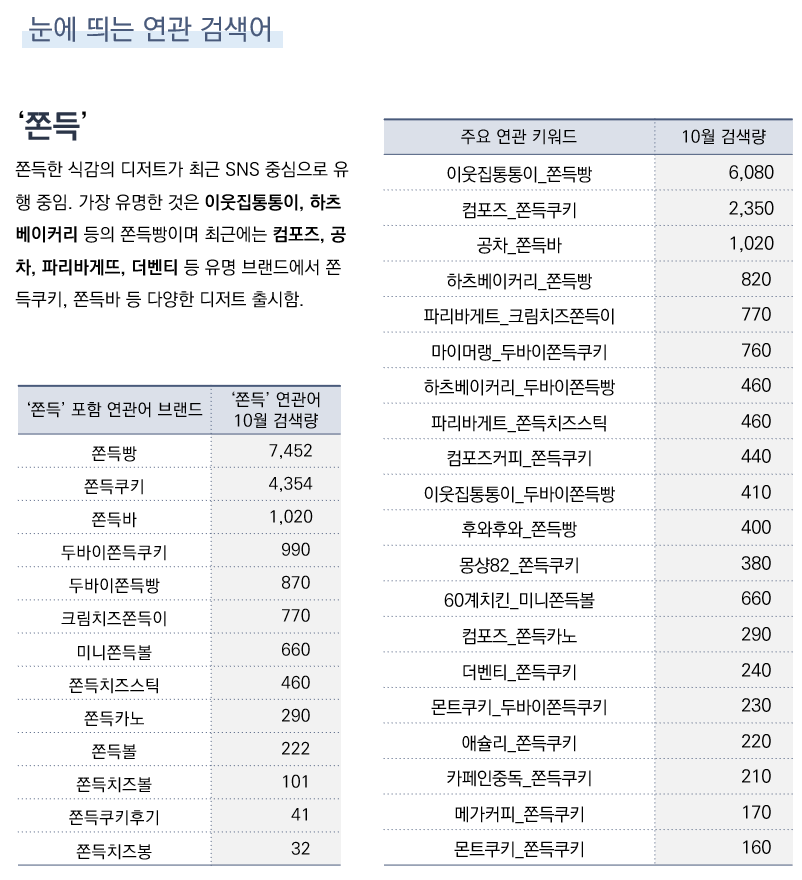 10월 데이터가 담겨 있는 리포트에서는 두바이 쫀득쿠키를 포함하여 쫀득한 식감의 디저트가 인기를 얻는 현상을 '쫀득'이라는 테마로 묶어 HOT TRENDS 로 소개하고 있습니다. 두바이 쫀득 쿠키 뿐만 아니라 쫀득빵, 쫀득바, 쫀득치즈스틱, 쫀득카노 등 다양한 디저트류에 대한 연관 키워드와 검색 데이터 현황을 보여줍니다.
