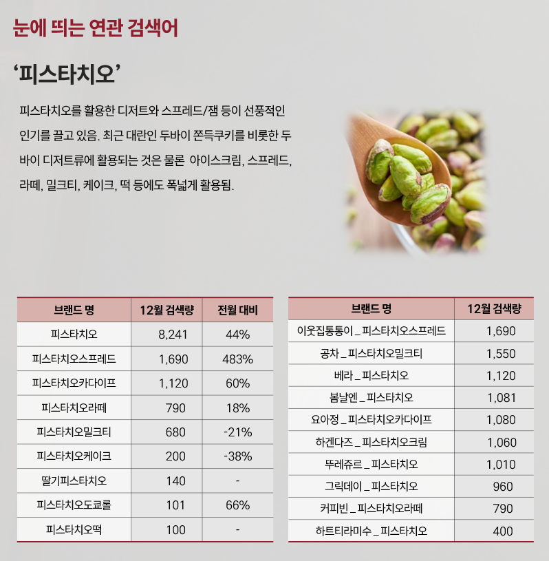 12월호에서는 두바이쫀득쿠키를 비롯하여 다수의 디저트에서 '피스타치오'가 활용되는 현상을 HOT TREND로 다루었습니다.
