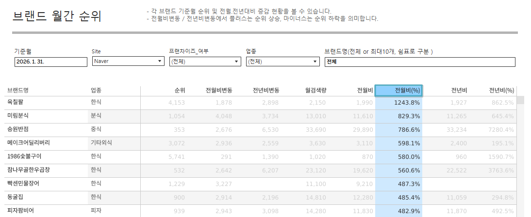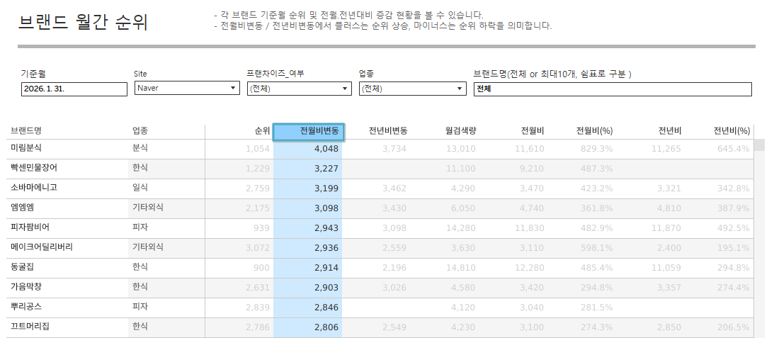 브랜드 월간 순위 페이지에서는 전체 외식 브랜드의 순위 전월/전년 동월 대비 증감 등을 확인하실 수 있는데요. 모든 항목은 내림차순/오름차순 소팅이 가능합니다.