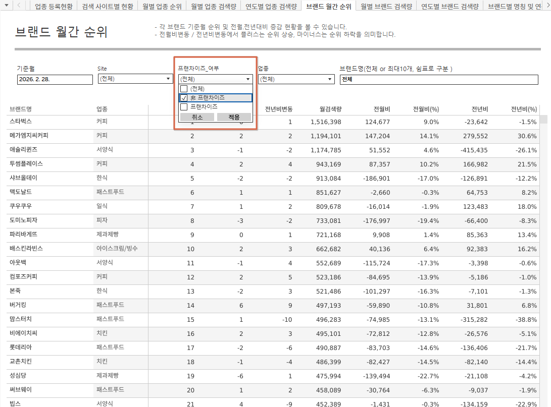 외식 브랜드의 검색 데이터를 조사하여 여러 순위를 발표하고 있습니다.
