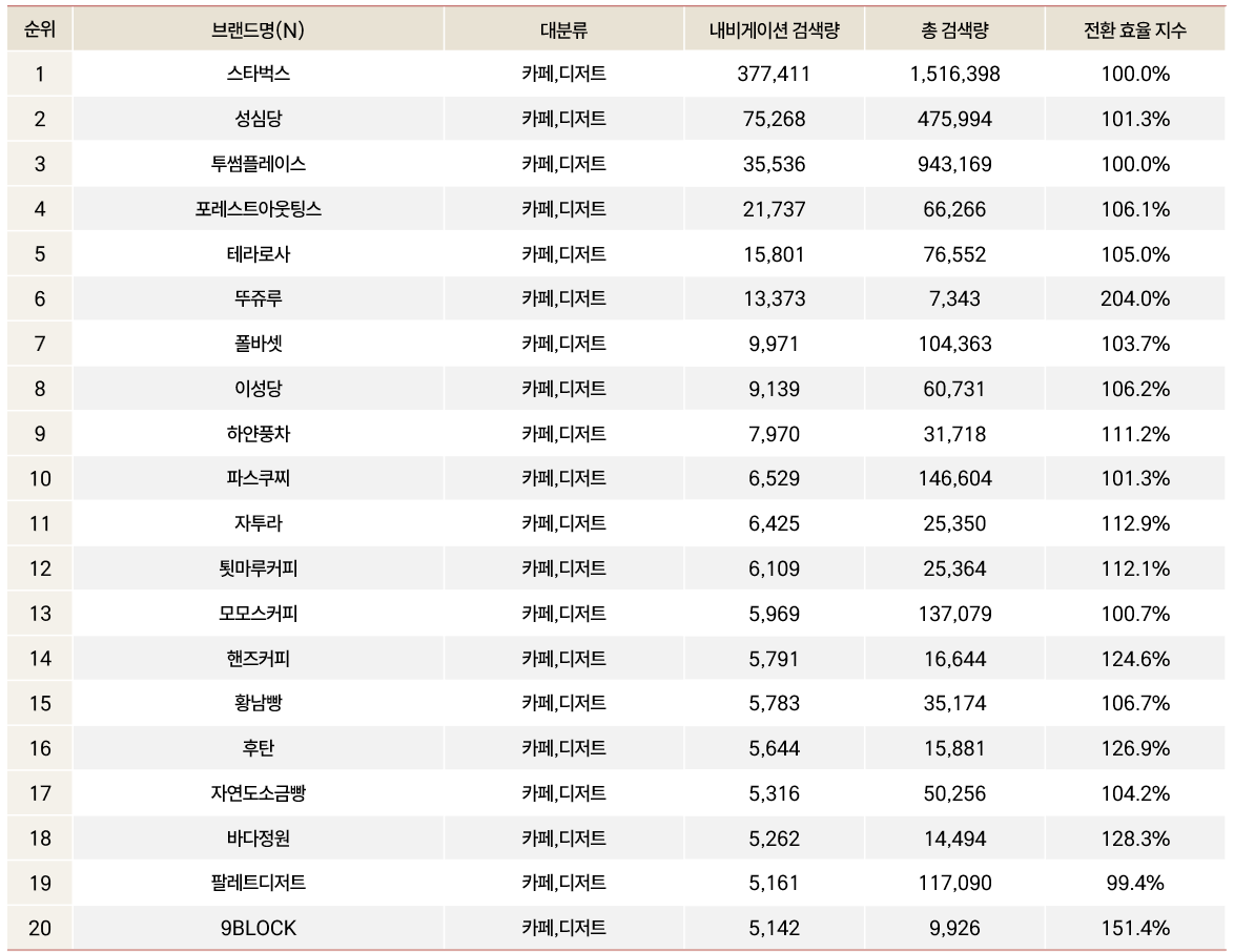 ** 도심과 외곽을 가리지 않고 많은 지점이 있는 '스타벅스'가 압도적인 검색량으로 1위에 올랐습니다.